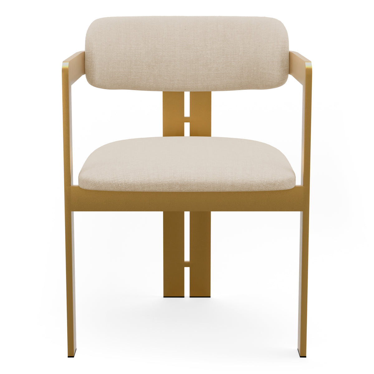 With its distinctive silhouette, the armrests of this chair merge effortlessly into the front legs, and the curved backrest is supported by two sleek rear legs. The seat is upholstered in Stratford pearl fabric, complemented by a brushed brass finish frame for a polished and stylish look. A statement piece that blends functionality with contemporary elegance.W. 57.5 | D. 59 | H. 80 | SD. 52 | SH. 48.5 | AH. 71 cm