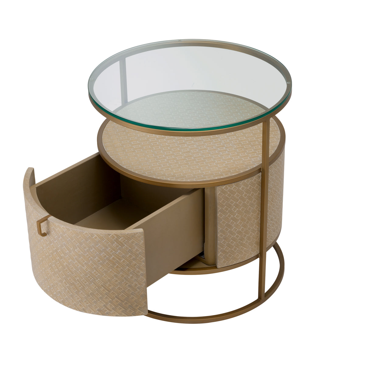 Pairing Bauhaus style with a Mid-Century Modern look, the tapered Napa Valley Side Table showcases a sleek brushed brass finished frame, a clear glass tabletop and a drum-shaped centrepiece that is lined with woven washed oak veneer, containing a drawer with a stainless steel handle.