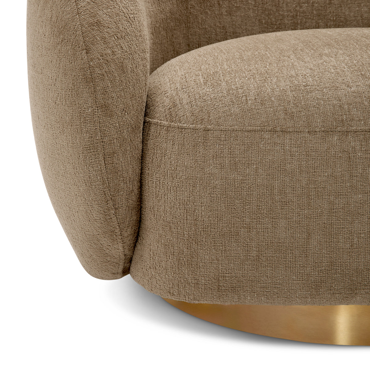 With its soft silhouette and brown fabric, this stylish swivel chair adds a modern yet inviting touch. The brushed brass base brings a hint of luxury. Complete the look with the Brice Sofa.W. 96 | D. 85 | H. 74 | SD. 61 | SH. 42 | AH. 62 cm