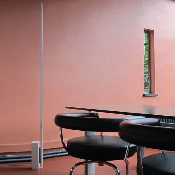 Efficient floor lamp with highly versatile linear luminous output. Body in aluminum extruded and opal white polycarbonate diffuser, junctions and fixing components in die-casted aluminum and steel. White finishing with elements painted in grey.