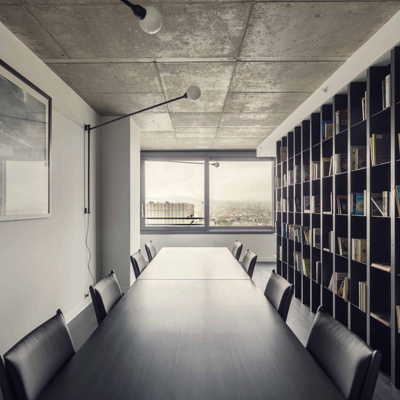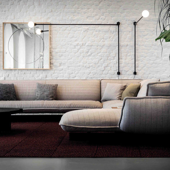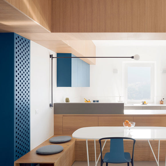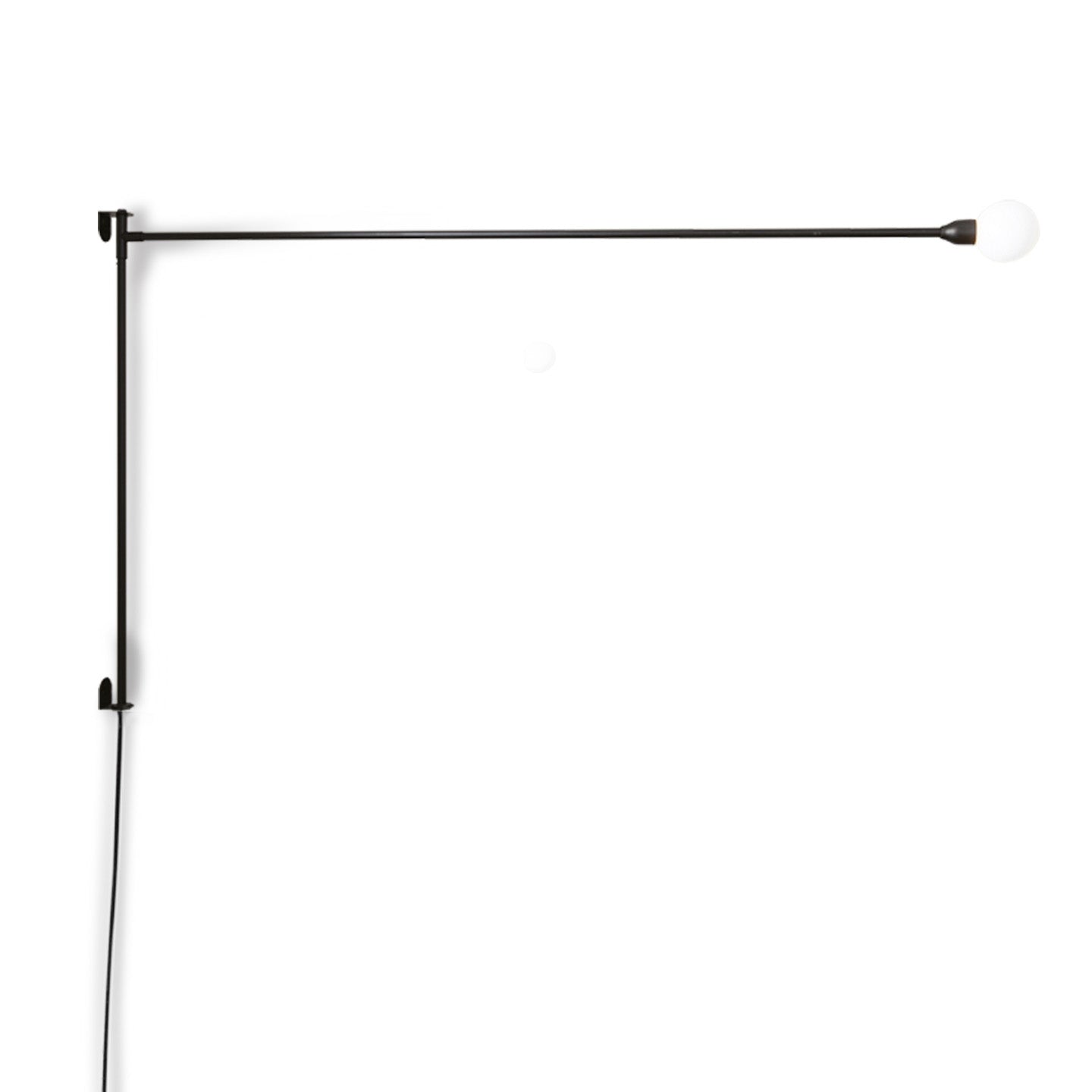 Embossed wall lamp inspired by the boom of sailboats. In aluminum and metal painted matt black, also available in the Mini version with reduced dimensions. The arm is fixed to the wall and rotates on the horizontal axis, forming an angle of almost 180°. Power cord supplied with plug and dimmer.