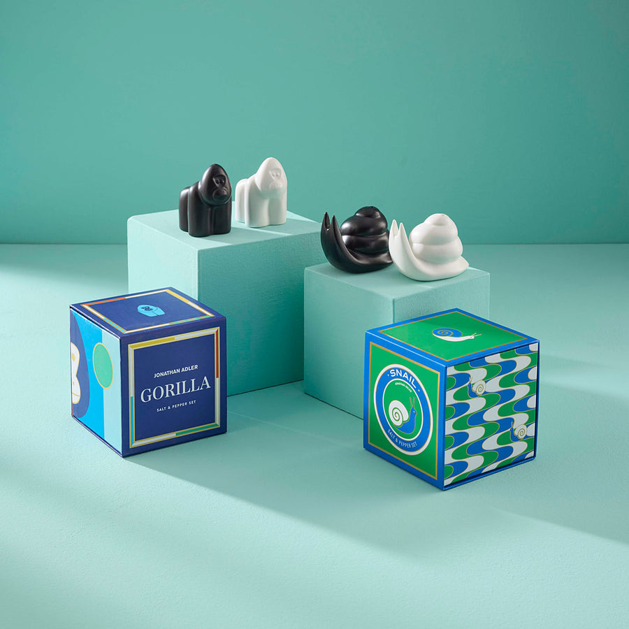 Don't forget a dash of mid-century modernism at mealtime. Our Snail Salt and Pepper shakers—one black, one white—are crafted from high-fired porcelain.