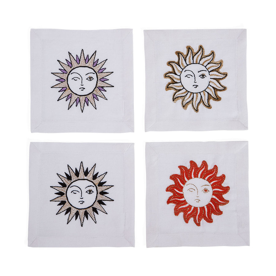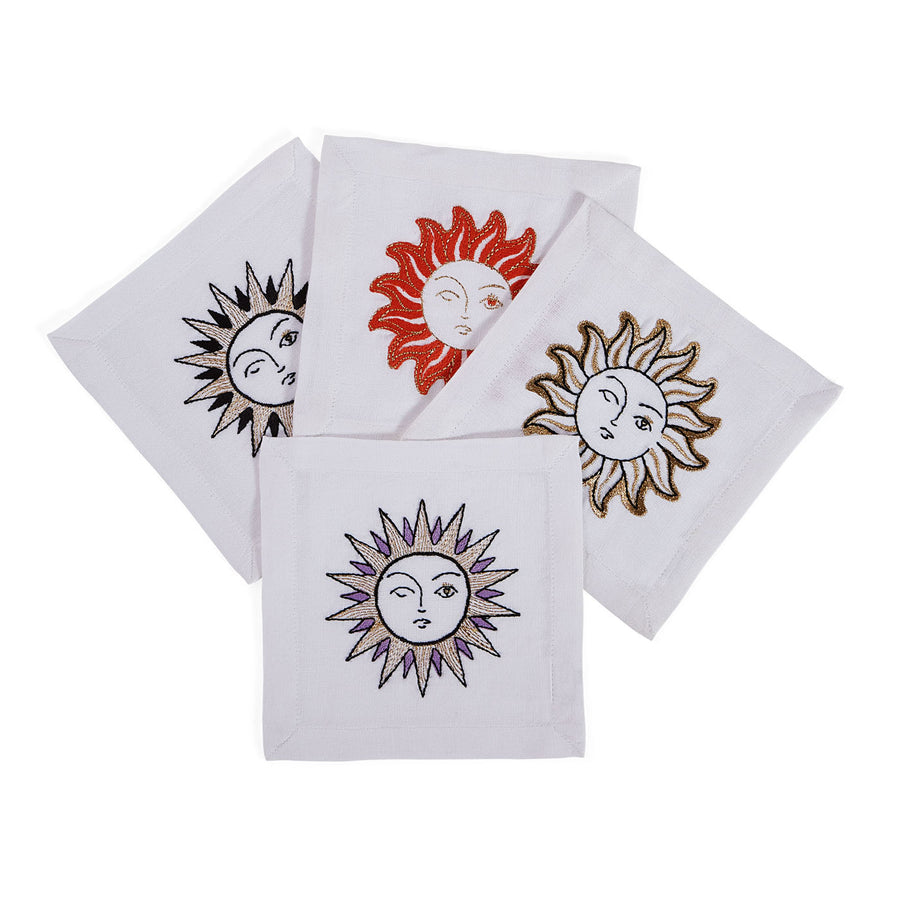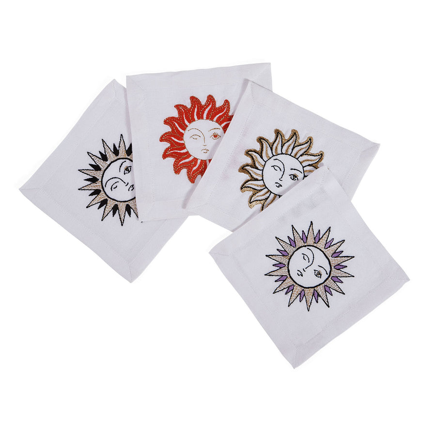 The perfect pairing with cocktails and canapés, these beauties even elevate basic bar nuts. Embroidered on luxe linen, our four unique Muse suns are a wink to Gatsby and Gilded Age glamour.